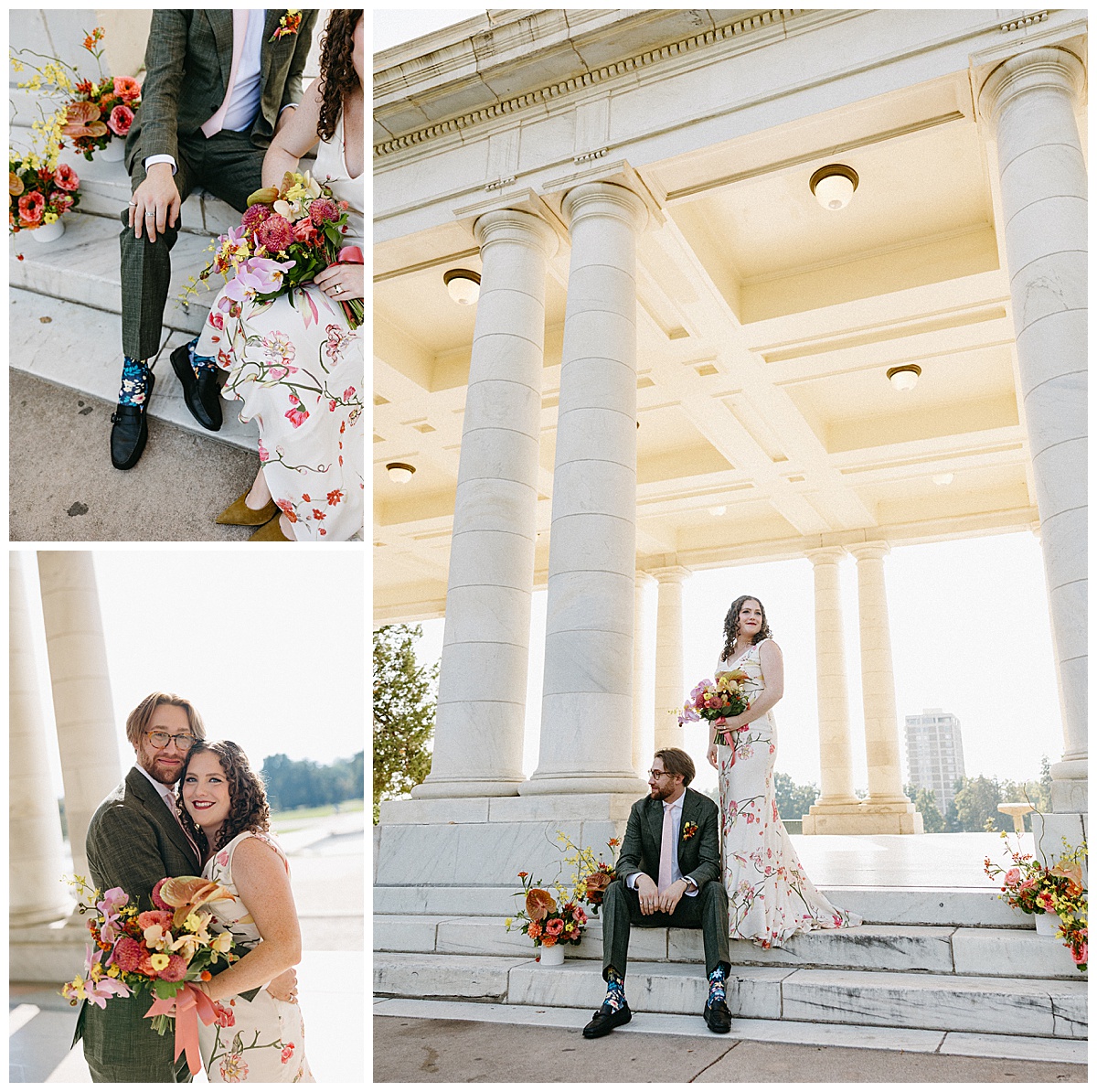 Their ceremony included around 15 of their closest friends and family. The pavilion at Cheesman Park is so elegant, so they didn’t need to spend much money on anything to elevate the space. A few floral arrangements on the steps was just enough to level it up.