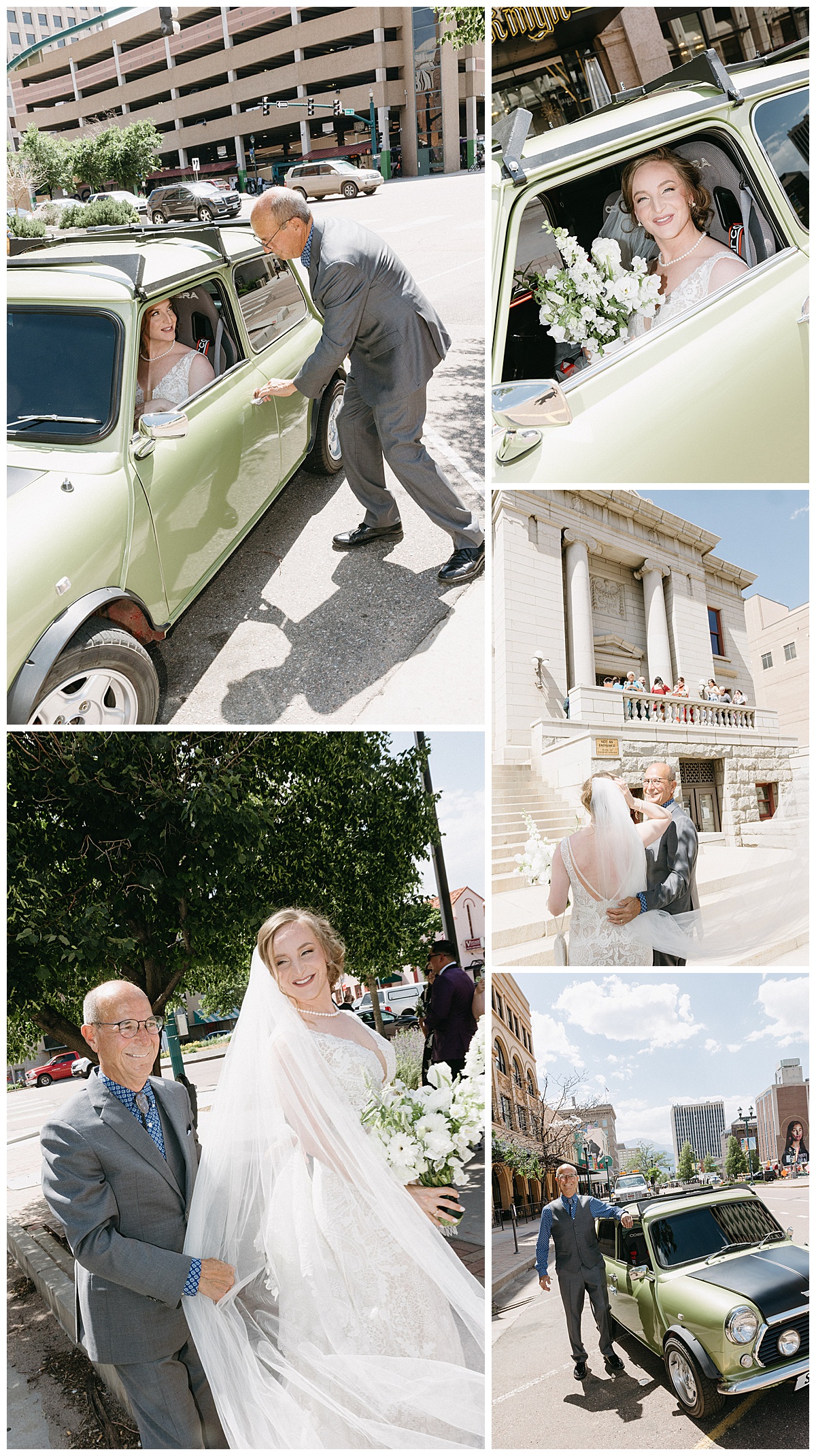 Once everyone was ready, it was time to head over for their Colorado Springs courthouse wedding. Bianca rented a Mini Cooper because they’re her favorite, and her dad drove her to the courthouse in it. It was literally a block away, but she wanted a grand entrance moment. Respect.